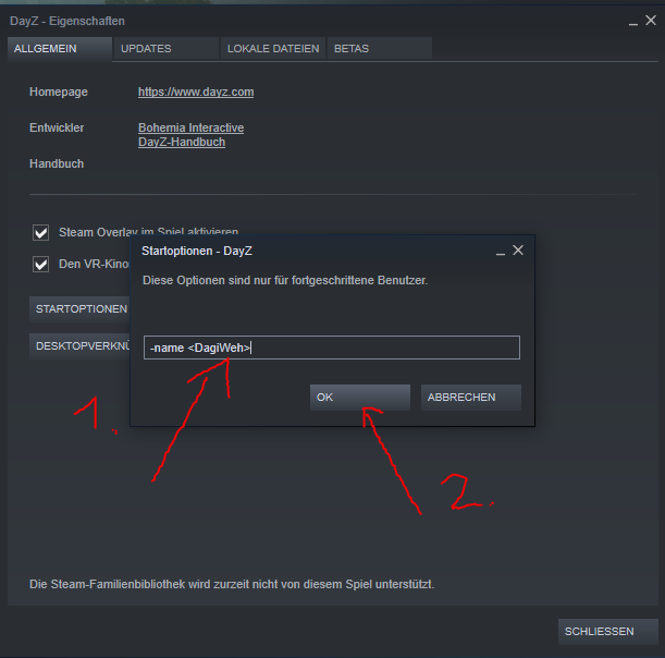 In Steam mit Rechtsklick auf DayZ --> Einstellungen --> Startoptionen --> In das Pop-up Fenster das hier eintragen: -name <Spielername> --> OK Klicken
